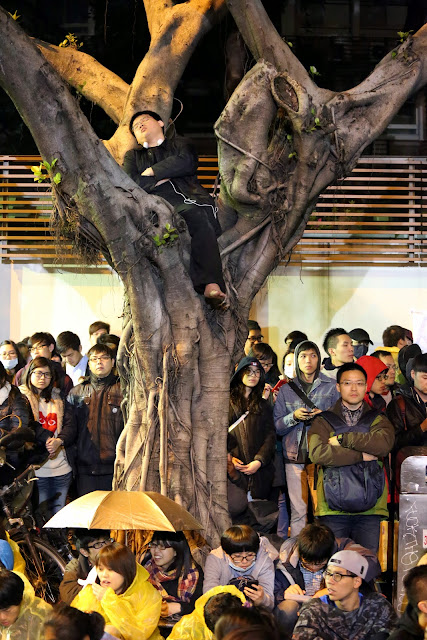 這篇的主題是在反服貿的過程中,在人群中睡著的各種狀況。有睡在榕樹上